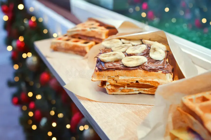 Warme wafels, meestal hart- of ruitvormig, met poedersuiker of warme toppings.