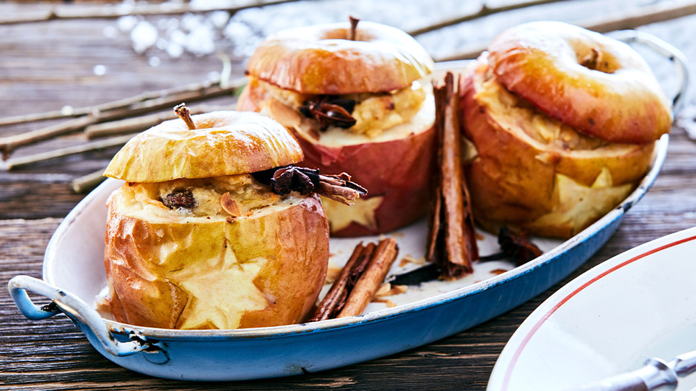 Gebakken appels gevuld met noten, rozijnen en specerijen.