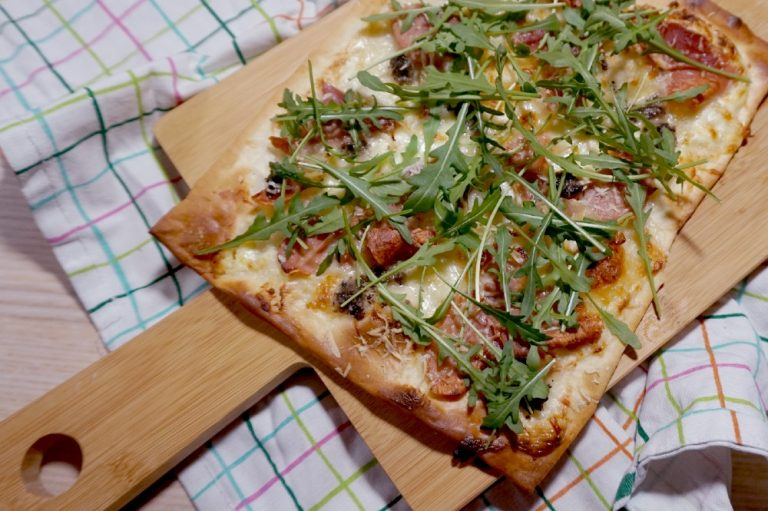 Dunne deegbodem met crème fraîche, ui en spek, vers uit de oven.
